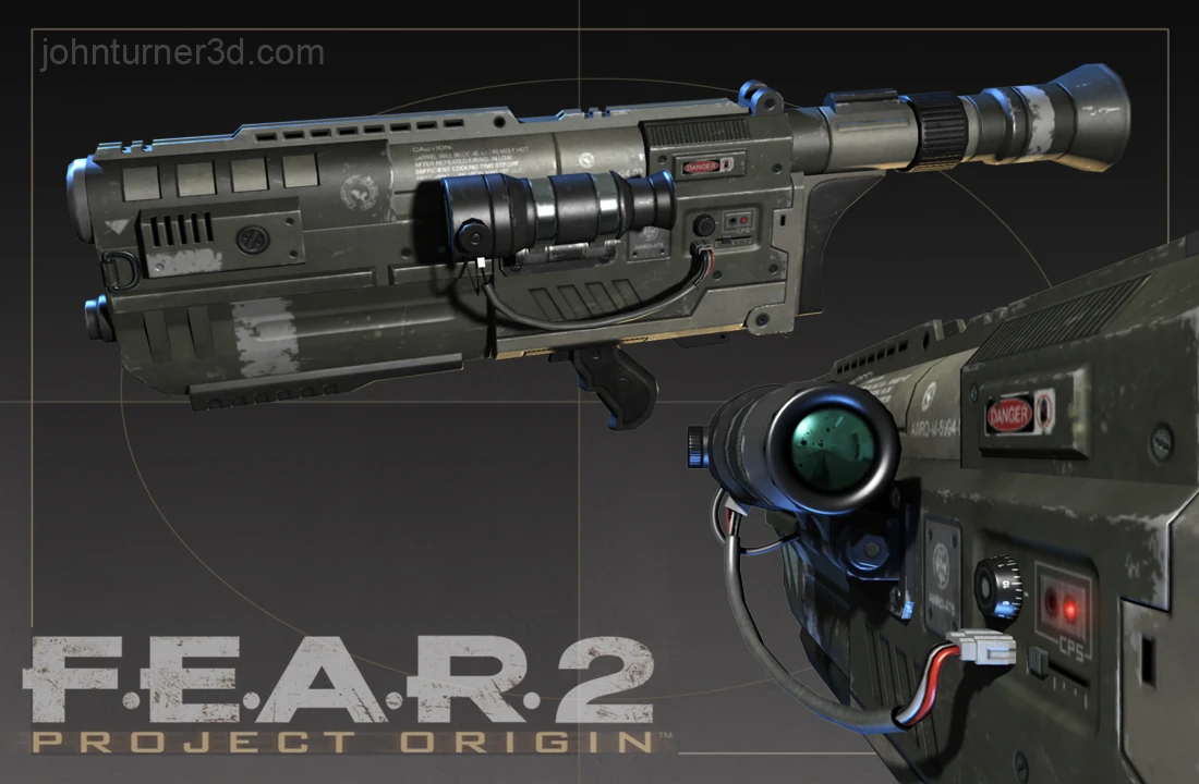 PERFORMING WEAPON MAINTAINANCE. - Interestingly, while the first F.E.A.R. game's missile launcher is fired in a burst, the F.E.A.R. 2 Project Origin missile launcher is fired just like a normal missile launcher. This is because the F.E.A.R. missile launcher is based on another Monolith game called SHOGO: Mobile Armor Division.